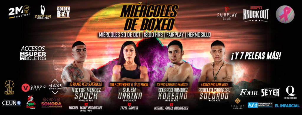 Una noche de boxeo de primer nivel que incluye una pelea femenil de élite en el marco de la concientización de prevenir el cáncer de mama, el inicio de actividades con un atractivo programa de peleas amateurs, la ambientación en el sonido de la carismática DK Karen Fierros, todo en la majestuosa sede que será el Fairplay Club de Hermosillo, y con la transmisión en vivo a nivel internacional por ESPN Knock Out, será la excelente combinación que presentarán 2M Promotions, Zanfer y Golden Boy este próximo miércoles, con acceso de público cumpliendo los protocolos de prevención y sanidad de las autoridades de salud de Hermosillo y de la Comisión de Box de Sonora.