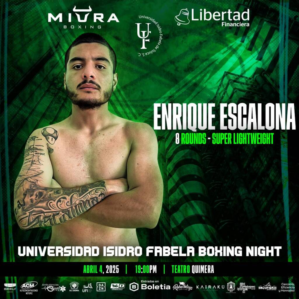 Al formar parte de la atractiva cartelera que presenta Miura Boxing, con el apoyo de Libertad Soluciones de Vida, Universidad Isidro Fabela, Municipio de Metepec e IMCUFIDEM, Enrique escalona, quien considerado una estrella ascenso, buscará obtener un espectacular triunfo al encarar a Eduardo “Choco” Cortes, en un duelo acordado a ocho episodios en la escala de peso superligero.