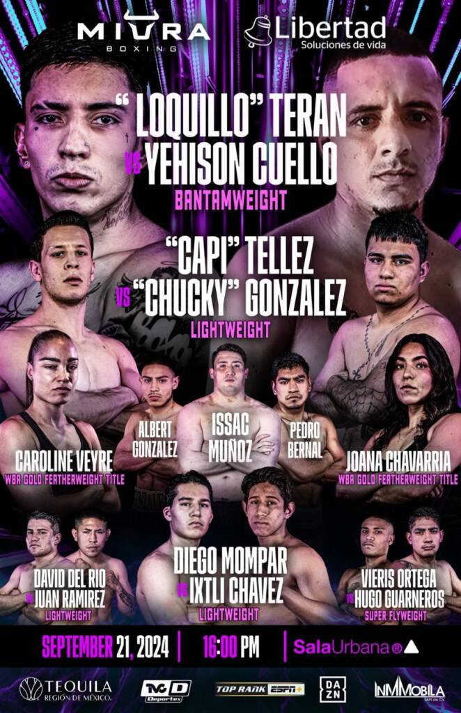 En un combate que promete estar repleto de emociones, el púgil capitalino Andrés “Loquillo” Terán le hará frente al colombiano Yehison Cuello, en el que será el turno estelar de la velada que ofrece Miura Boxing, que encabeza Manuel Garrido, con el apoyo de Libertad Soluciones de Vida, Tequila Región de México e Inmmobila, y que podrá ser visto a través de ESPN+ para Estados Unidos y Canada y DAZN en México el resto del mundo a partir de las 18:30 horas y por TVC Deportes en Mexico a partir de las 20:30 horas.