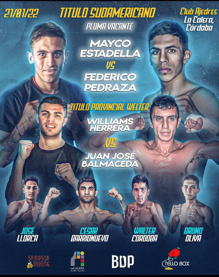 ARGENTINA ‐ Un cruce excepcional entre dos peleadores invictos, Mayco Estadella y Federico Pedraza, por el título sudamericano pluma vacante, será el pleito estelar de este viernes 21 de enero en el Club de Ajedrez, de La Calera, Córdoba, en otra producción de Sampson Boxing y Tello Box, con televisación de TyC Sports desde la medianoche.