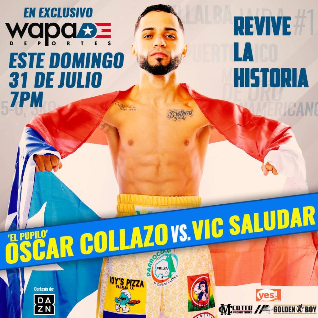 “Puerto Rico podrá revivir la histórica pelea de Oscar Collazo vs. Vic Saludar, este domingo por WAPA Deportes. Estamos muy agradecidos con DAZN y Golden Boy por permitirnos los derechos y a WAPA Deportes por su compromiso genuino con Oscar y con el boxeo en Puerto Rico. Este domingo podrán disfrutar de lo grande que es Oscar Collazo dentro del ring, no se la pueden perder,” comentó el presidente y promotor Héctor Soto.