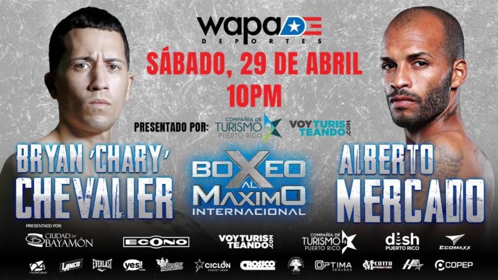 Caguas, PUERTO RICO – Este sábado 29 de abril a las 10 de la noche por WAPA Deportes regresa la plataforma de boxeo más importante de Puerto Rico “Boxeo Al Máximo Internacional” desde la Cancha José Pepín’ Cestero de Bayamón, cuando el quinto clasificado y campeón Intercontinental de la Organización Mundial de Boxeo en la división super pluma; Bryan ‘Chary’ Chevalier (18-1-1, 14KOs) se enfrenta al peligroso y escurridizo Alberto ‘Transformer’ Mercado (17-5-1, 4KOs) en un combate a 10 asaltos en las 130 libras.