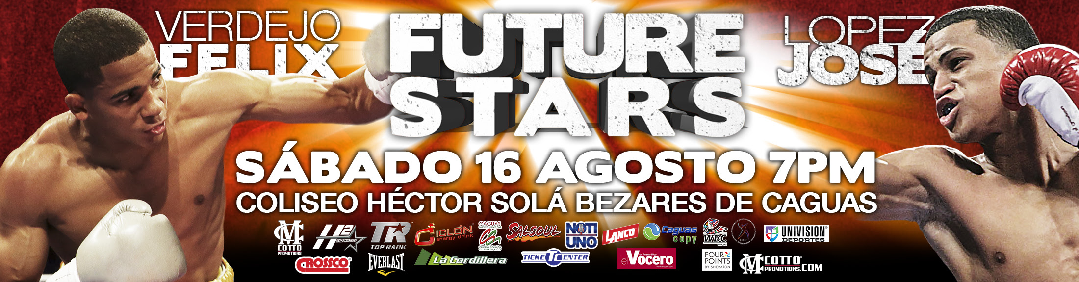 El programa, que será transmitido como parte de la serie ‘Solo Boxeo Tecate’ de Univisión, incluirá otros siete combates. “FUTURE STARS” es presentado por Cotto Promotions en asociación con Top Rank y H2 Entertainment y será transmitido en vivo desde las 11:00 de la noche para los Estados Unidos a través de Univisión Deportes.