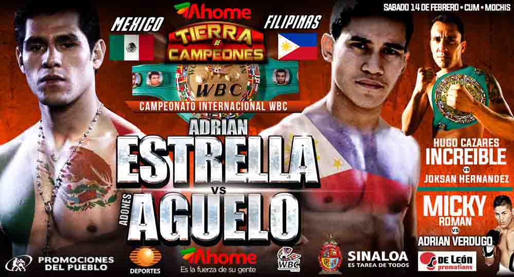 El invicto ponchador regiomontano Adrián “Diamante” Estrella vuelve a los encordados el próximo 14 de febrero en el flamante Centro de Usos Múltiples de Los Mochis, Sinaloa; defendiendo el título Internacional superpluma del Consejo Mundial de Boxeo ante el tagalo Adones Aguelo.