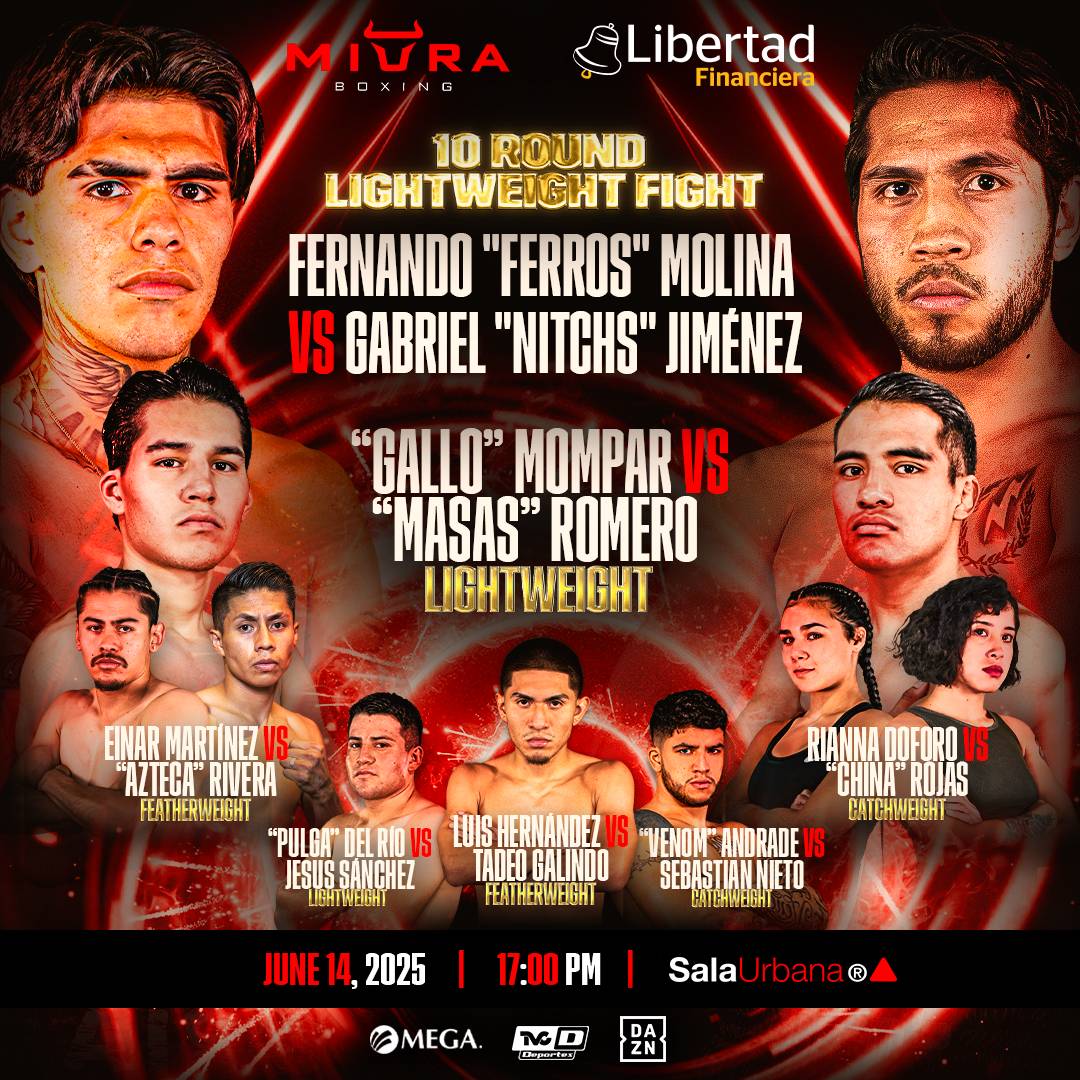 Con atractivo cartel conformado por jóvenes figuras del boxeo en ascenso regresa la acción del boxeo este sábado al centro de espectáculos Sala Urbana de Naucalpan, Estado de México.La cartelera ofrecida por Miura Boxing, con el apoyo y patrocinio de Libertad Soluciones de Vida y Mega, contará el el turno estelar el duelo conformado por el tapatío Fernando “Ferros” Molina (11-0-1, 4 Ko’s) y el capitalino Gabriel “Nitchs” Jiménez (11-1-0, 7 Ko’s) en una guerra pactada a 10 rounds en peso ligero.