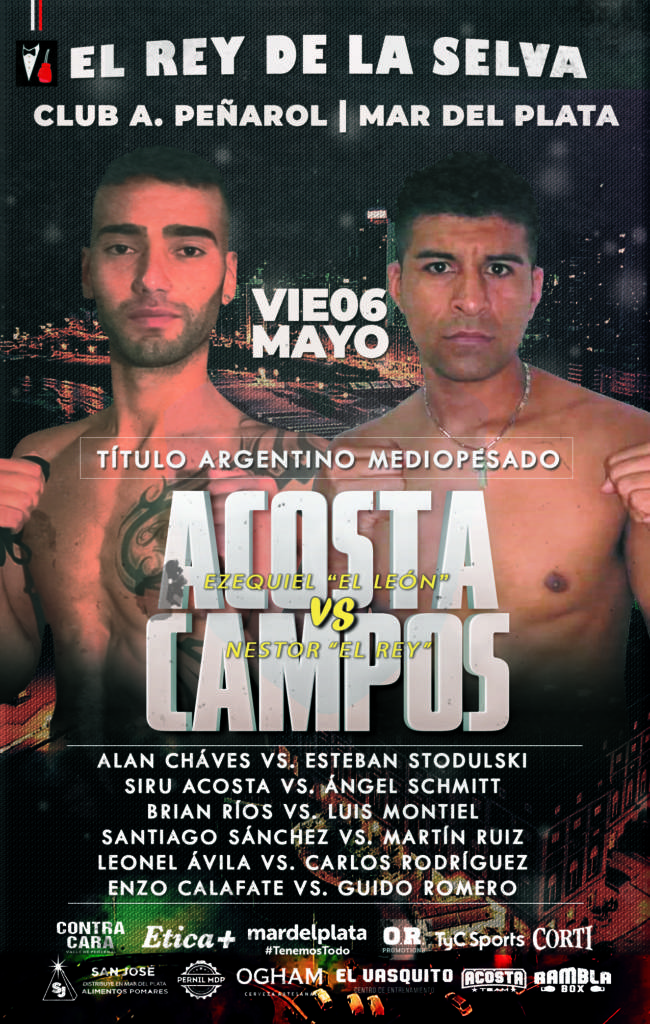 El marplatense Ezequiel “El León” Acosta (10-0-0, 7 KO), realizará su primera defensa del título argentino mediopesado frente al bonaerense de Néstor “El Rey” Campos (5-2-0, 4 KO) en una nueva producción de OR Promotions, que se desarrollará el próximo viernes 6 de mayo a partir de las 21:00 en el Club Atlético Peñarol de la ciudad balnearia. El evento, denominado “El Rey de la Selva”, será transmitido en vivo desde las 23:00 por la pantalla de TyC Sports para toda Latinoamérica, y vía streaming a las 21:00 por TyC Sports Play.