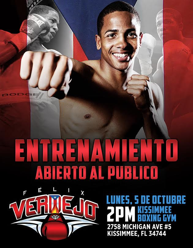 Kissimmee, FLORIDA – El sensacional boxeador boricua Félix ‘El Diamante’ Verdejo estará de visita en la ciudad de Kissimmee mañana lunes, 5 de octubre, para compartir un buen rato con sus seguidores de la Florida durante un entrenamiento abierto al público.