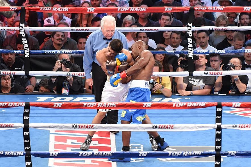 Antes que nada tenemos que felicitar a Jessie Vargas (izquierda) quien ganó via cloroformo en el noveno asalto el campeonato wélter de la Organización Mundial de Boxeo (O.M.B.) ante Sadam Ali quien llegó a Washington, D.C. invicto con horizonte a usurpar la popularidad de Vargas quien con paciencia lanzó su golpe de gancho de diestra que se esta convirtiendo en su favorito para no dejar duda sobre su triunfo y no dejar la decisión a manos del referí al cual se le olvidaron las matemáticas.