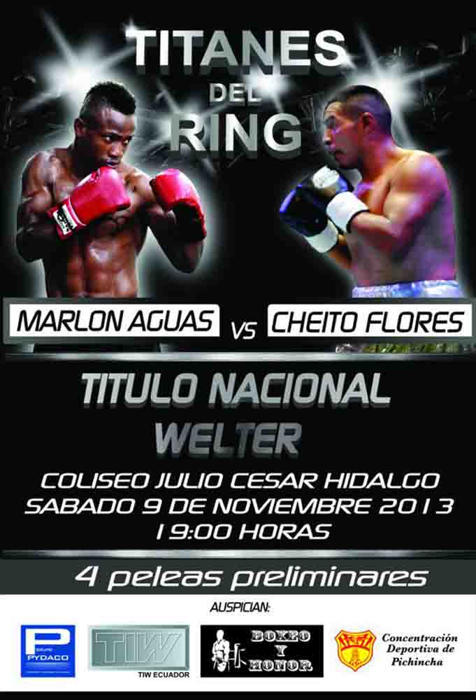 Por petición del público amante del boxeo en Ecuador, la empresa ‘Boxeo y Honor’, dirigida por el ingeniero Ramiro Delgado, decidió llevar el pleito entre el prometedor Marlon ‘La Furia Neg Aguas y Eduardo ‘Cheíto’ Flores, en las 147.00 libras el 9 de noviembre en el Coliseo ‘Julio Cesar Hidalgo’.