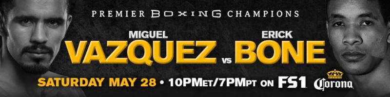 SAN ANTONIO – Former world champion Miguel “Titere” Vazquez (35-5, 13 KOs) is set to take on super lightweight contender Erick Bone (16-3, 8 KOs) in the 10-round main event of Premier Boxing Champions(PBC) on FS1 and FOX Deportes from the Dancehall in San Antonio on Saturday, May 28 with televised coverage beginning at 10 p.m. ET/7 p.m. PT.