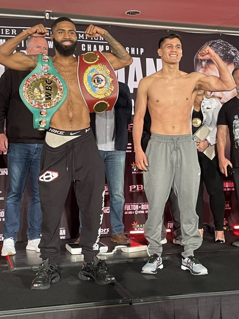 Con sus dos cinturones de campeonato sobre cada hombro, Stephen Fulton caminó con confianza hacia Daniel Roman para posar para las fotos después de que lograron el peso el viernes por la tarde.