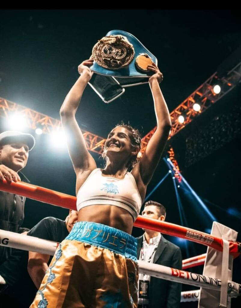 Originaria de Coachella, California, Gabriela Fundora conquistó el campeonato conquistó el cinturón de las 112 libras (50.802 kg.) que avala la Federación Internacional de Boxeo, tras derrotar en el quinto episodio a la regiomontana Arely ‘Ametralladora’ Muciño, a quien derribó en dos ocasiones antes de imponer su poderío y gran técnica en el encordado, el pasado 21 de octubre en el Kia Forum de Inglewood, California.
