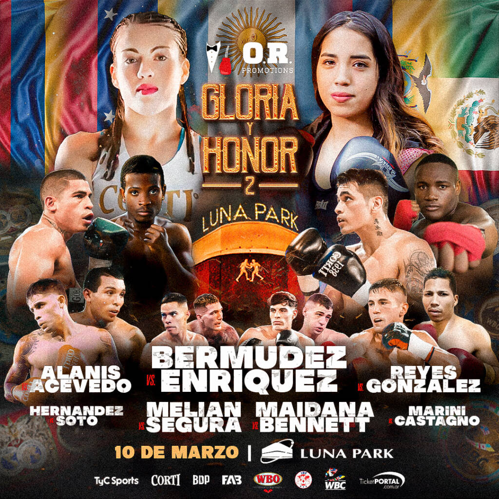 ARGENTINA – El próximo viernes 10 de marzo, comienza un nuevo ciclo lunar con “GLORIA Y HONOR 2”, una impactante cartelera que tendrá lugar en el mítico templo del boxeo, el Estadio Luna Park, que contará una vez más con la organización integral de OR Promotions, la promotora más importante de la región, y la transmisión en vivo de TyC Sports y TyC Sports Play a partir de las 21:00 (hora local) en su tradicional espacio: “Boxeo de Primera”.