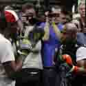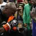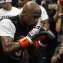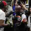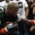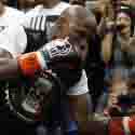 Mayweather llegó al gimnasio cona su séquito y comenzó a lanzar golpes y a entrenar como de costumbre, ante casi un centenar de personas que se dieron cita para ver la práctica del campeón invicto.