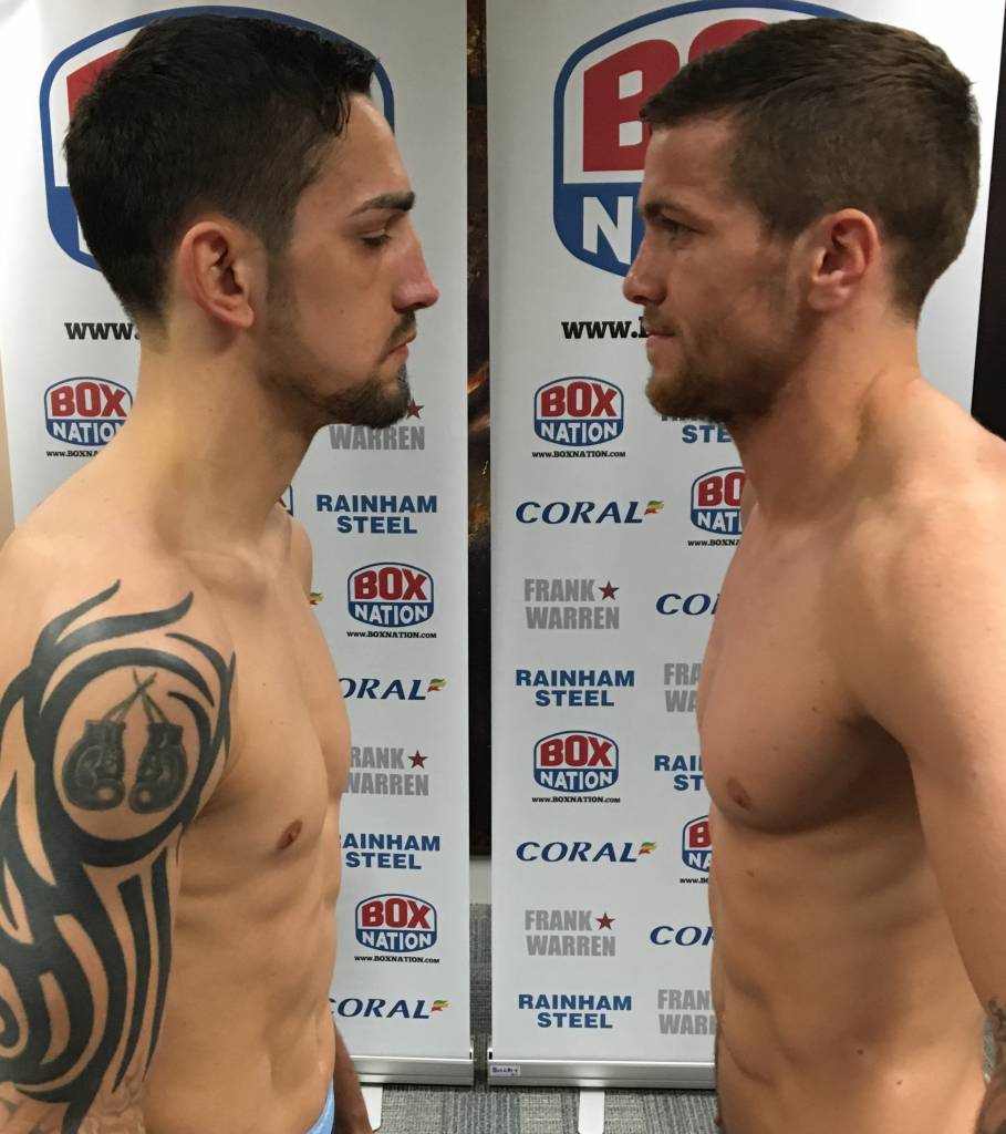 The chief supporting bout also weighed in Chingford hotshot Tom Baker and Margate’s Jack Morris who collide for the Vacant English Light-Heavyweight Championship.