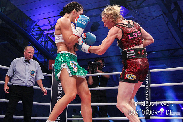 The reason for the decision: In the fifth round of their WBO-/WBF Junior Middleweight Championship bout Christina Hammer blocked Mathis’ left arm in a clinch. Referee Manfred Küchler didn’t stop the action so Mathis continuously hit Hammer with her free right arm to the left side of her head. Hammer went down from those punches and couldn’t continue.