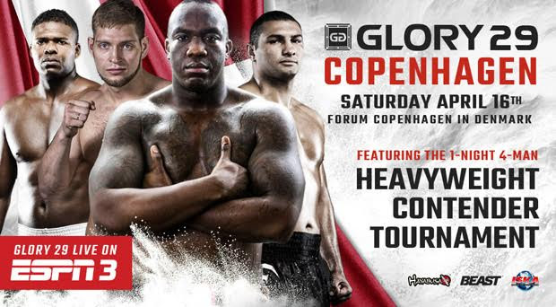 GLORY 29 Copenhagen airs live on ESPN3, Saturday, April 16 at 4 p.m. ET / 1 p.m. PT, with a replay in primetime that evening on ESPN2 at 9 p.m. ET / 6 p.m. PT. For Spanish-language viewers, the event will also air on ESPN Deportes at 7 p.m. ET / 4 p.m. PT on Saturday, April 30.