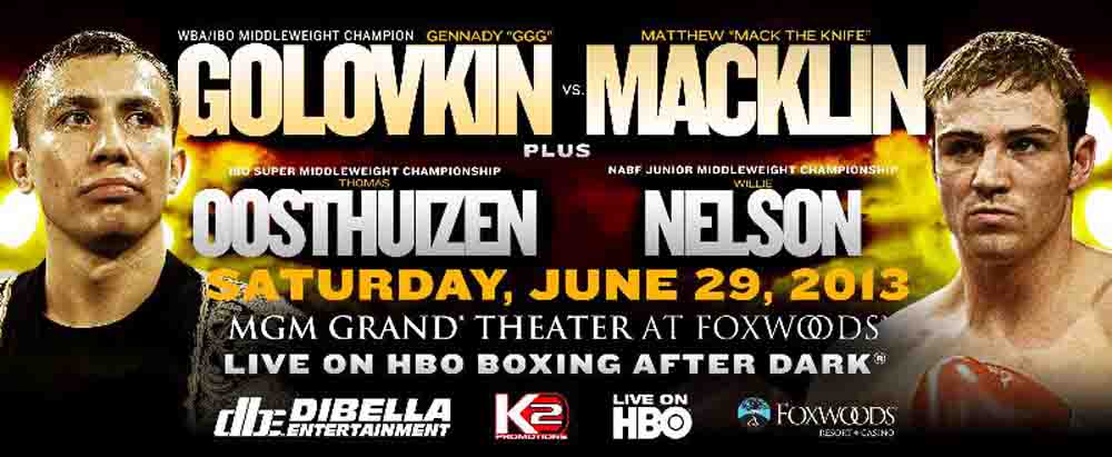 El kazako Gennady Golovkin, campeón mundial peso medio, retuvo su título en la noche del sábado 29 de junio al derrotar por nocaut al púgil inglés Matthew Macklin. En el primer asalto Macklin inició lanzando jabs de izquierda acompañados de ganchos de izquierda y derecha al cuerpo y a la cara de Golovkin, mientras que éste último colocó un gancho de izquierda que tambaleó al inglés faltando segundos para concluir la ronda.