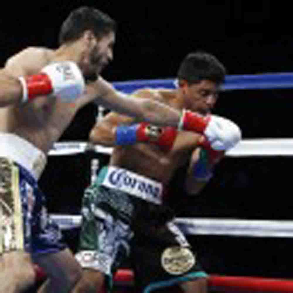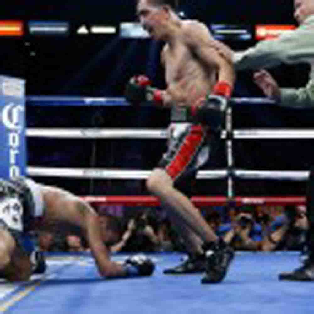Like Gonzalez, Santa Cruz of Los Angeles, by way of Huetamo, Michoacan, Mexico, went to work early and often against Terrazas, throwing 267 punches in just two and a half rounds. Terrazas, of Guadalajara, was cut just under the right eye in the second round and Santa Cruz took advantage landing punch after punch, finally sending Terrazas down for a nine-count, and then again for an eight-count midway through the third. Referee Lou Moret halted matters at 2:09 of the third round.