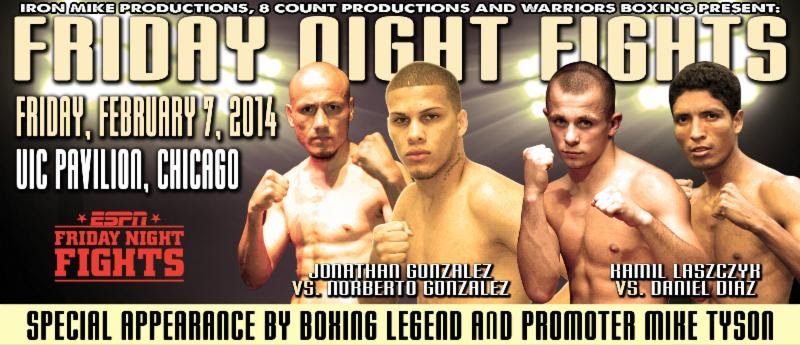 On Friday, February 7, 2014, Mike Tyson and Garry Jonas (Iron Mike Productions), Dominic Pesoli (8 Count Productions) and Leon Margules (Warriors Boxing) will proudly present another installment of Friday Night Fights at the UIC Pavilion in Chicago, and televised worldwide on ESPN Friday Night Fights.
