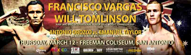 Vargas vs. Tomlinson, is a 10-round WBO International and NABF Junior Lightweight bout is promoted by Golden Boy Promotions and Lejia*Battah Promotions. Orozco vs. Taylor is a 10-round junior welterweight fight promoted by Golden Boy Promotions in association with Star Boxing. The HBO Latino Boxing two-fight telecast begins at 9:45 p.m. ET/PT. The event is sponsored by Corona Extra and Mexico – Live It To Believe It!. The Freeman Coliseum doors will open at 5:00 p.m. CT, and the first bout will start at 5:30 p.m. CT.