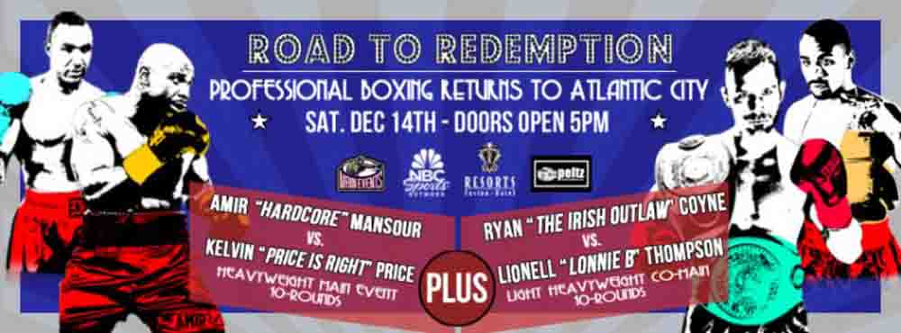 mansour_price_coyne_thompsonATLANTIC CITY, NJ – A pair of hungry heavyweights are ready to do battle on the Atlantic City boardwalk on the next edition of NBC Sports Network’s FIGHT NIGHT, December 14th. Undefeated knockout artist Amir Mansour, 19-0, 14 KOs, takes on super-sized Kelvin Price, 14-1, 6 KOs, in an anticipated 10-round confrontation at the Superstar Theatre at Resorts International Hotel and Casino. The fight is expected to provide both heated heavyweight action and a clear cut answer as to which fighter has a future in the division.
