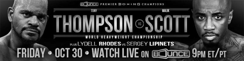ORLANDO, FL (October 7, 2015) – A heavyweight clash between Tony “The Tiger” Thompson (40-5, 27 KOs) and Malik “King” Scott (37-2-1, 13 KOs) will headline Premier Boxing Champions (PBC) – The Next Round on Bounce TV and BounceTV.com on Friday, October 30 from The Venue at UCF, located behind the CFE Arena in Orlando, Fla.
