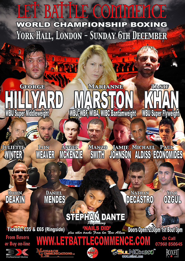 Tasif Khan vs Isaac Quaye, Marianne Marston vs Csilla Nemedi and George Hillyard vs TBA World Title bouts co-headline the Monarch Communications, BoxFit UK, 3X Sports and Sulnox Eco Systems PLC sponsored Mark Lyons and Marianne Marston co-promoted LET BATTLE COMMENCE event at York Hall, Bethnal Green, London on Sunday 6th December 2015.