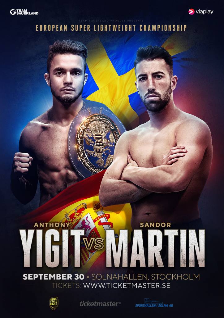 Tickets for the European Super Lightweight Championship clash between Anthony Yigit and Sandor Martin go on sale today at 9.00 (CEST) and are available online via www.ticketmaster.se or by calling the ticket hotline on (+46) 077-170 70 70.