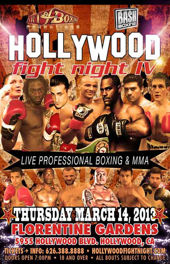 (626) 388-8888. HOLLYWOOD FIGHT NIGHT takes place on Thursday, March 14, 2013 at the Florentine Gardens, located at 5955 Hollywood Blvd. in Hollywood, California.