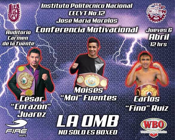 Por esta razón y demostrando como lo dice nuestro presidente Francisco “Paquito Valcárcel” la WBO/OMB NO SOLAMENTE ES BOXEO López Santos comentó: asistirán tres excelentes Campeones con la finalidad de buscar que la juventud politécnica se motive para continuar con mucho ánimo sus estudios en el nivel medio superior de esta casa de estudios.