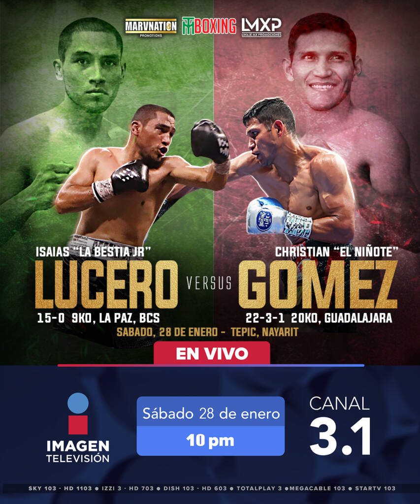 Este sábado, 28 de enero, se vivirá la segunda cartelera del año que presenta TM Boxing en asociación con MarvNation como parte de la serie semanal “La Nueva Imagen del Boxeo” por la cadena Imagen TV. La noche será encabezada por el oriundo de La Paz, Baja California Sur, y aún invicto Isaiás ‘’Bestia Jr” Lucero (15-0, 9KO) ante el experimentado tapatío Christian ‘’Niñote’’ Gomez (22-3-1, 20KO) desde Tepic, Nayarit, con el conocido Eduardo Camarena en la narración acompañado de los legendarios campeones mundiales mexicanos Jorge ‘’Travieso’’ Arce y Erik ‘’Terrible’’ Morales.