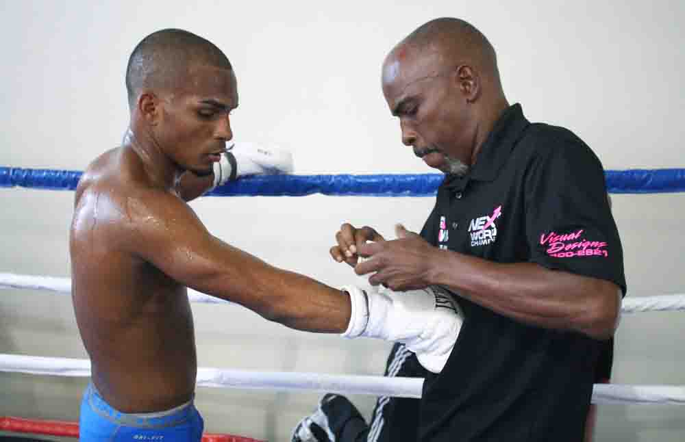 González y Calderón estuvieron más de 10 minutos haciendo sombras sobre uno de los cuadriláteros del gimnasio, aprovechando el retirado púgil para hacer movimientos como Segura y hablarle al más joven peleador.