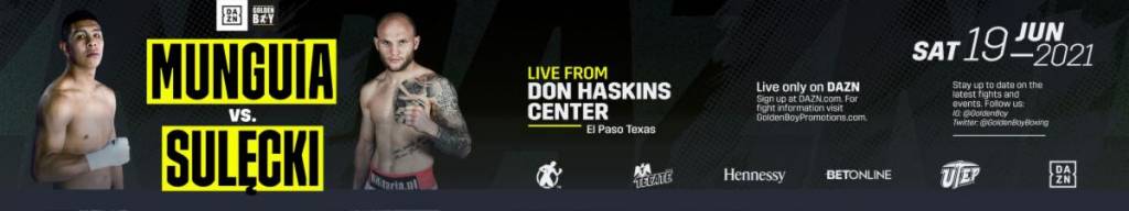 “Me siento muy emocionado de estar regresando el 19 de junio”, dijo Jaime Munguía. “Sé que será una tremenda pelea ante Maciej Sulecki. Creo que es un gran peleador. Voy a tratar de brindar una gran pelea para todo el público en El Paso, Texas y para todos que me estarán viendo desde sus casas. Muchas gracias por su apoyo”.