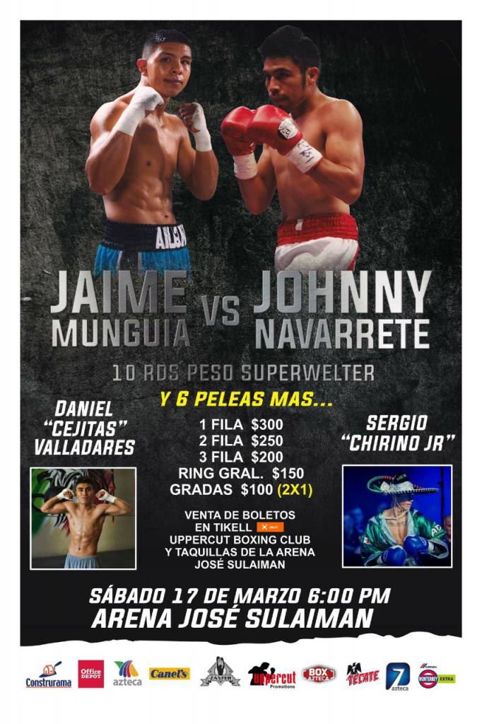 Munguía (27-0, 23 kos) se enfrentará a Navarrete (33-11-2, 19 kos)  de la dinastía de los ¨Vaqueros¨ a diez rounds en peso Superwelter y será el combate estelar.