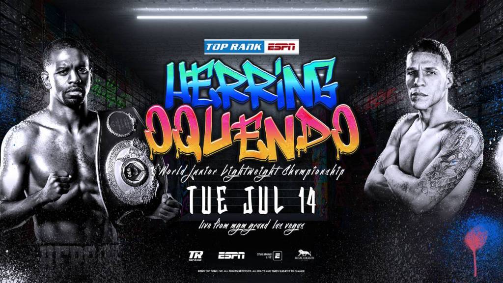 Herring (21-2, 10 KOs) hace su debut del 2020 después de un 2019 que lo vio sorprender a Masayuki Ito para ganar el título y superar a Lamont Roach Jr. frente ante más de 7,000 fanáticos en un estadio de béisbol al aire libre en Fresno, California. Herring y Oquendo estaban listos para pelear el 2 de julio, pero el resultado positivo a COVID-19 de Herring atrasó la pelea por 12 días. Herring, el capitán del equipo olímpico de boxeo de los Estados Unidos en el 2012, tiene marca de 5-0 desde que firmó un acuerdo de múltiples peleas con Top Rank.