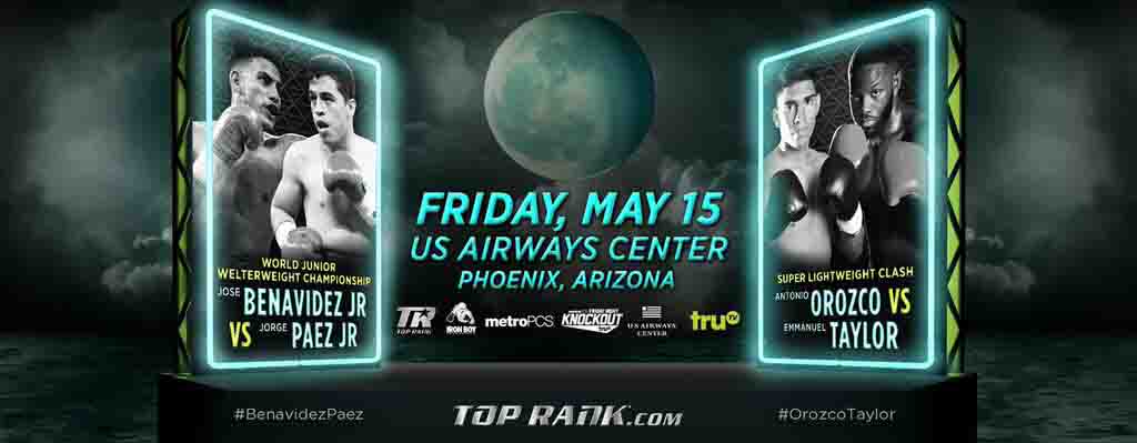 PHOENIX, AZ (April 30, 2015) — Phoenix’s favorite son is coming home — to defend his world title. Undefeated World Boxing Association (WBA) interim super lightweight world champion JOSE BENAVIDEZ, JR. will be making his first title defense, against Mexican buzz saw JORGE “Maromerito” PAEZ, JR., Saturday, May 15 at US Airways Center. The world championship battle will be televised live on “The MetroPCS Friday Night Knockout on truTV” at 10:00 p.m. ET. The live telecast will open with undefeated Top-10 contender ANTONIO “Relentless” OROZCO in a 10-round super lightweight rumble with power-punching EMMANUEL “The Tranzforma” TAYLOR.