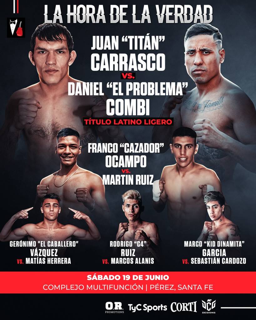 En el pleito que encabeza el festival, denominado “La hora de la verdad”, estará en juego el cinturón latino de la Federación Internacional de Boxeo (FIB), categoría ligero (vacante), que disputarán el mendocino de capìtalino y ex selección nacional, Juan “Titán” Carrasco (9-1-0, 6 KO), y el bonaerense de La Matanza, Daniel “El Problema” Combi (8-3-0, 2 KO). El mismo se encuentra programado a la distancia de diez asaltos de 3×1.