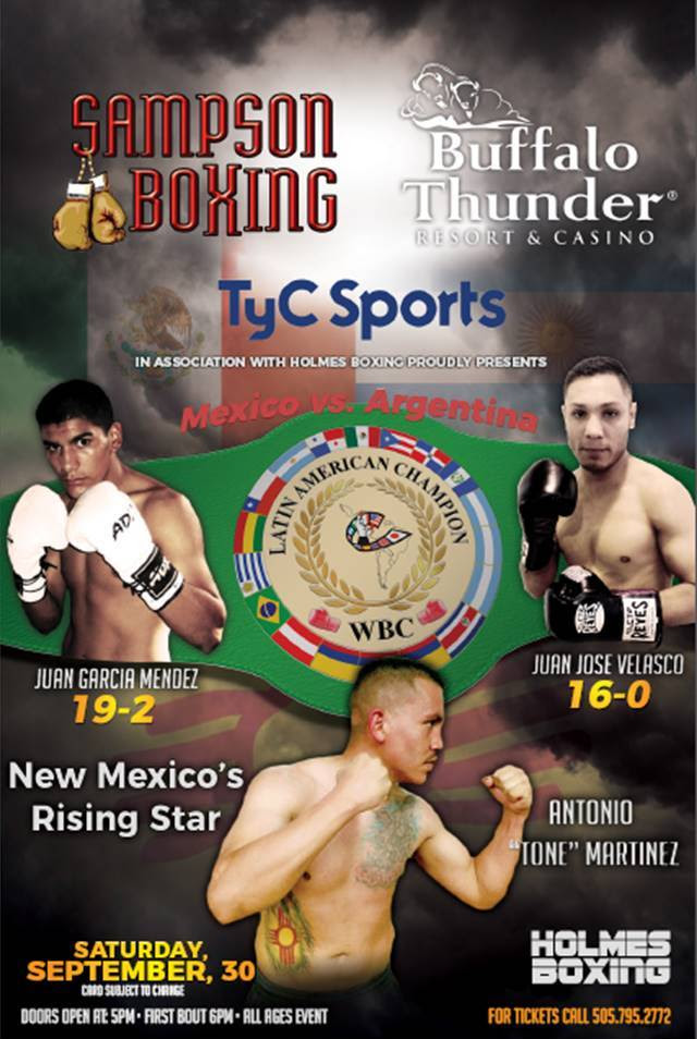 El invicto jujeño, radicado en la Ciudad de Buenos Aires, Juan José “El Pitbull” Velasco realizará el combate más importante de su carrera el próximo sábado 30 de septiembre cuando se enfrente al mexicano Juan García Méndez, en búsqueda del título latino súper ligero vacante del Consejo Mundial de Boxeo, en una cartelera internacional que se realizará en el Buffalo Thunder Resort and Casino de Pojoaque, Nuevo México, Estados Unidos.
