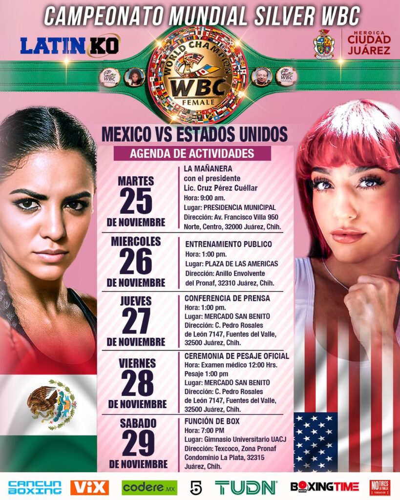 Semana intensa de actividades, donde los protagonistas de ‘Por las Mujeres de Juárez’ tendrán oportunidad de convivir con la fanaticada; la agenda promocional arranca este martes 25 de noviembre en punto de las 9:00 de la mañana donde la clasificadaundial número uno del WBC, Diana ‘La Bonita’ Fernández asistirá a ‘La Mañanera’ con el alcalde Cruz Pérez Cuéllar en el Palacio Municipal; para el miércoles 26 de noviembre, en punto de la 1:00 de la tarde los estelaristas de la papeleta sostendrán un entrenamiento abierto a medios de comunicación y público en general en Plaza de Las Américas; para el jueves 27 de noviembre en el Restaurante Mercado San Benito tendrá lugar la Rueda de Prensa la 1:00 de la tarde donde los protagonistas de la cartelera estarán frente a frente con los representantes de la prensa especializada; para el viernes 28 de noviembre todos los participantes de la cartelera tienen una cita con la báscula en el Pesaje Oficial, aunque antes deberán librar un riguroso examen médico por parte de la Comisión de Box local al filo del mediodía en el Mercado San Benito; para el sábado 29 de noviembre en el Gimnasio Universitario UACJ de Ciudad Juárez, sonará el primer campanazo de la cartelera que vestirá de rosa el importante recinto desde las 7:00 de la noche, con la presencia del equipo de expertos de Box Televisa conformado por ‘El Zar’ Carlos Aguilar, el gran campeón Marco Antonio Barrera, la histórica ‘Princesa’ Jackie Nava y el triple campeón mundial Fernando ‘Kochulito’ Montiel.