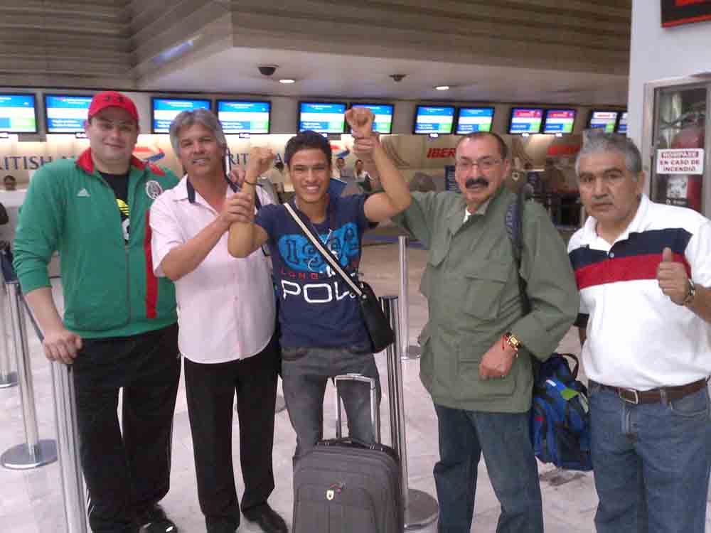 El menor de los hermanos Ceja Pedraza, acompañdo de su equipo de trabajo se embarcó con rumbo a tierras británicas, donde estará dispuando el cetro universal en un interesante duelo entre el primero y segundo sembrados del organismo con sede en los Estados Unidos.