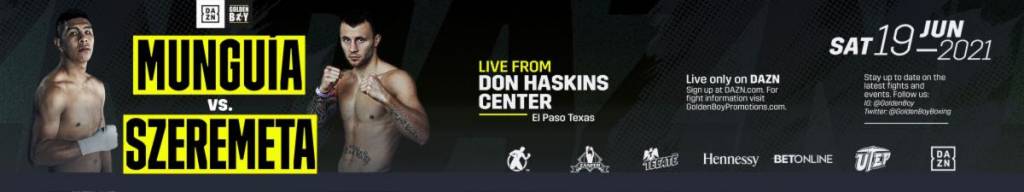 Munguía vs. Szeremeta es un combate a 12 giros por el cetro mediano Intercontinental de la OMB presentado por Golden Boy en asociación con Zanfer Promotions y Warrior’s Boxing. El evento es patrocinado por Tecate, “The Official Beer of Boxing,” Hennessy “Never Stop. Never Settle,” y “BetOnline – Your Online Sportsbook Experts.”