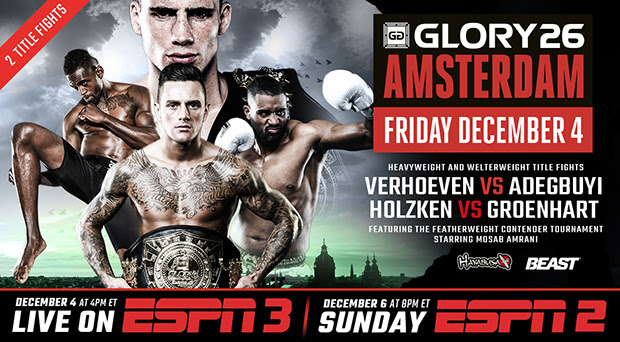 For the first time ever, GLORY programming will also air on ESPN Deportes for Spanish-language viewers, beginning with a replay of GLORY 26 Amsterdam on Sunday, Dec. 6 at 4 p.m. EST / 1 p.m. PST.