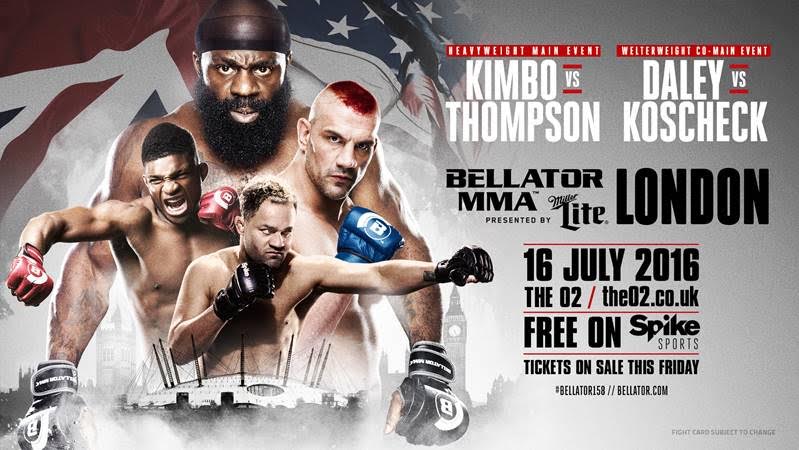 SANTA MONICA, Calif. (April 18, 2016) – It was the most-watched fight in the history of mixed martial arts with 7.28 million viewers, and on Sunday night Bellator MMA President Scott Coker joined ESPN’s SportsCenter to officially announce that Kimbo Slice (6-2) and James Thompson (20-16) are going to run it back inside the world famous O2 Arena in London on July 16 during the main event of “Bellator 158: London.” The tentpole event also features another highly anticipated rematch in the co-main event — when a grudge match nearly six years in the making boils over as Josh Koscheck (17-10) takes on Paul “Semtex” Daley (38-13-2).