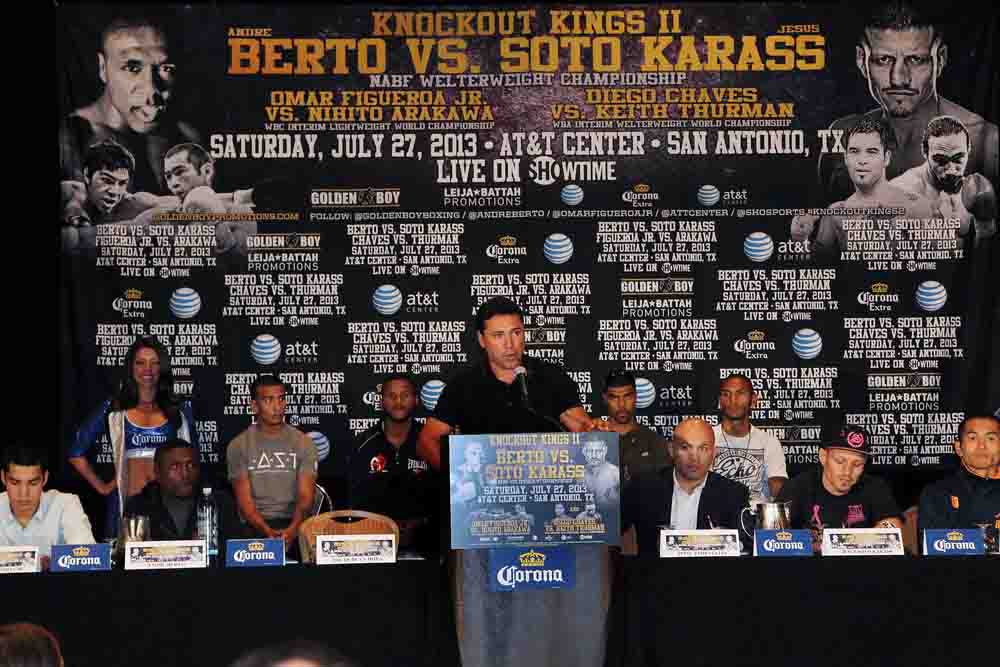 “Knockout Kings II,“ featuring former Two-Time Welterweight World Champion Andre Berto facing tough Mexican veteran contender Jesus Soto Karass in a 12-round main event for the vacant NABF Welterweight Championship, takes place Saturday, July 27 at the AT&T Center in San Antonio, Texas. The event is promoted by Golden Boy Promotions and Leija & Battah Promotions and sponsored by Corona and AT&T. In the 12-round co-featured attractions, Weslaco, Texas’ undefeated rising star Omar Figueroa Jr. squares off against Japan’s Nihito Arakawa for the vacant WBC Interim Lightweight World Championship in a fight promoted in association with Teiken Promotions and undefeated power-puncher Diego Chaves faces fellow unbeaten knockout artist Keith Thurman for Chaves’ WBA Interim Welterweight World Championship in a fight promoted in association with KO International. The tripleheader will be broadcast live on SHOWTIME® at 9:00 p.m. ET/PT and will be available in Spanish via second audio programming (SAP). Preliminary fights will air on SHOWTIME EXTREME® at 7:00 p.m. ET/PT (delayed on the West Coast).