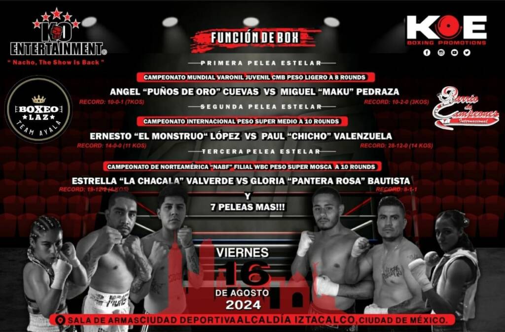 KO Entertainment, empresa promotora que encabeza Ignacio “Nacho” Huizar, empresario a quien se le recuerda por forjar las carreras de los campeones Jorge “Maromero” Páez, Cristian Mijares, Humberto “Zorrita” Soto, entre otros, sumando alianza con Barrio de Campeones de Dionicio Martínez, se dispone a regresar con una atractiva producción, la que albergará tres combates estelares con la disputa de los campeonatos Juvenil WBC de peso ligero, campeonato Plata Intercontinental WBC de peso supermediano y el campeonato femenil NABF de peso supermosca.