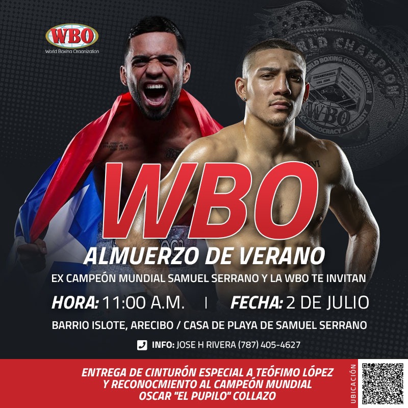 La Organización Mundial de Boxeo (OMB), presidida por el licenciado Francisco Valcárcel, realizará su reunión anual de leyendas del boxeo, campeones mundiales, prospectos y personalidades de interés, el próximo domingo, 2 de julio de 2023 en el barrio Islote en Arecibo en la casa de playa del excampeón mundial Samuel ‘Torbellino’ Serrano.