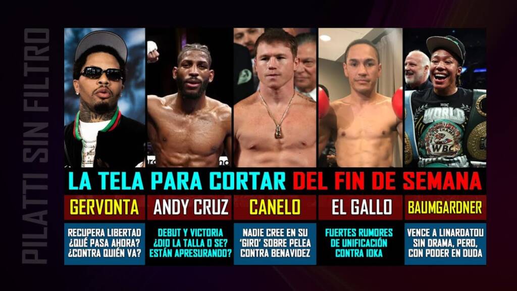 Bienvenidos a la tela para cortar del fin de semana. Aquí les traemos el comentario, la reacción, el punto de vista a las victorias de Andy Cruz y Alycia Baumgardner, lo que viene para Gervonta Davis tras salir de la cárcel, la reacción en las rede sociales al anuncio de Canelo sobre David Benavidez y el rumor que crece sobre gestiones iniciadas para una unificación supermosca entre Kazuto Ioka (AMB) y Juan Francisco Estrada (CMB).