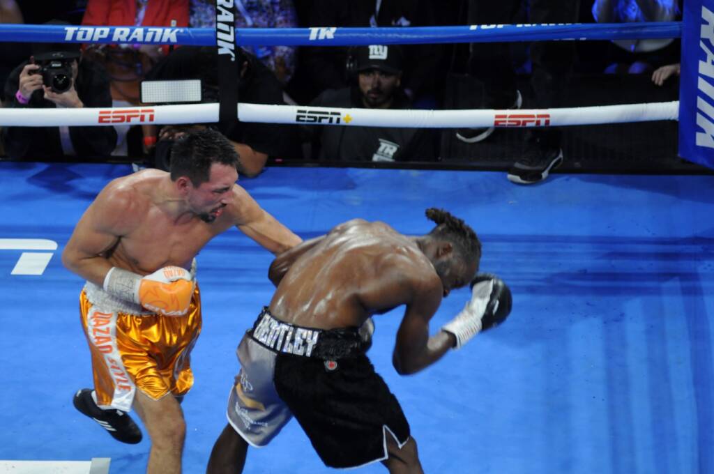 Los combates de Top Rank en el Palms casino si cumplieron con las expectativas de los amantes de hueso colorado del mamporro rentado, y vamos a darle el lugar que merece a la pelea estelar de campeonato entre el monarca mediano OMB Janibek Alimkhanuly, quien tuvo que recorrer toda la ruta de 12 rondas para merecer una victoria unánime ante Denzel Bentley, quien si fue un digno rival pero tuvo que haber hecho más para poder emparejar la balanza a favor de Janibek, que al menos duplicaba las guantadas, pero ambos estuvieron apostando al contragolpe y los pisotones no se hacían esperar. El doceavo asalto fue sin duda el más emocionante con Alimkhanuly a punto de ganar por la vía del cloroformo, pero Denzel hizo milagros para acabar en pie y hasta se puso al toma y daca en los últimos segundos del asalto final. Janibek al ser entrevistado dijo que en el boxeo cualquier cosa puede pasar, que sabía que su rival vendría bien preparado para una guerra, pero supo sacar su casta de campeón.