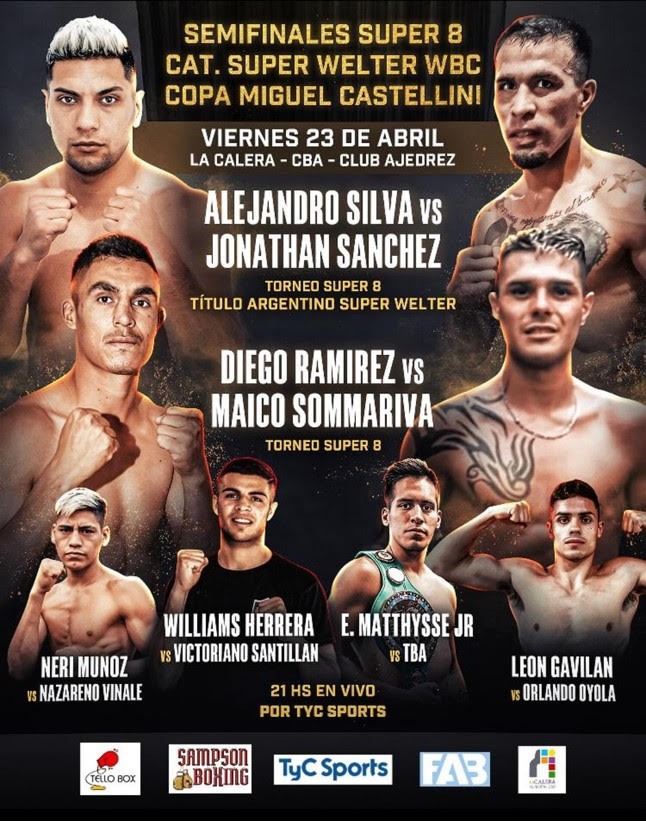 ARGENTINA – Las semifinales del torneo súper welter (Copa Miguel Ángel Castellini) y una cartelera de excelente nivel se llevarán a cabo este viernes 23 de abril en el Club de Ajedrez, de La Calera (Córdoba), en otra producción de Sampson Boxing y Tello Box, con la televisación de TyC Sports.